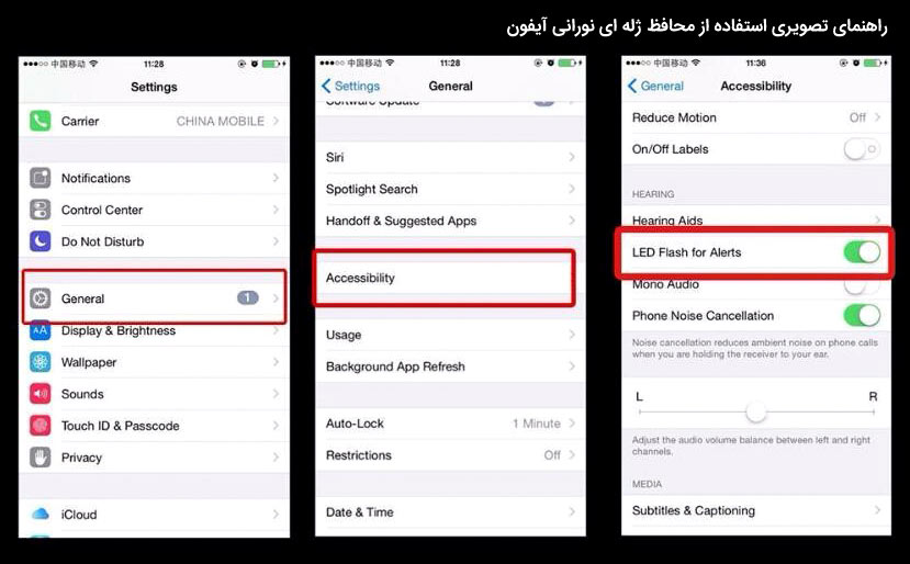 در تصویر بالا ملاحظه می کنید که برای نورانی شدن این محافظ حتماً باید در گوشی خود در بخش General و در قسمت Accessibility گزینهی LED Flash for Alerts را فعال نمایید.
